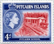 4-pence stamp depicts the schoolteacher's house, mislabelled "PITCAIRN SCHOOL". A corrected stamp labelled "SCHOOLTEACHER'S HOUSE" is issued in 1958.
