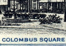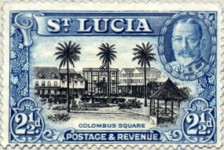 1-penny and 6-pence stamps misspell "COLOMBUS SQUARE", the second "O" should be a "U". This is corrected in the 1938 issue. 2 1/2-pence stamp depicts Columbus Square in Castries, mislabelled "COLOMBUS". The name was corrected on next issue in 1948.