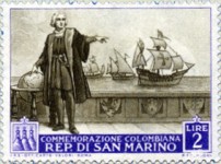 2- and 25-lira stamps depict Christopher Columbus with his hand on a globe of the Earth showing what appear to be modern outlines of the complete North and South America. The globe itself would not have existed for Columbus at the time, either.