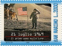 2000-lira stamp depicts a left-right flipped image of US astronaut Jim Irwin on the Moon during the Apollo 15 mission in 1971, and is erroneously captioned July 21, 1969.