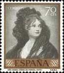 70-centimo stamp depicts detail of Goya's painting Isabel Cobos de Porcel, but the image is flipped left-right.