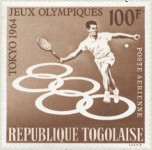 100-franc airmail stamp depicts tennis player over Olympic rings for 1964 Olympics in Tokyo, except tennis was not part of the Olympics in 1964.
