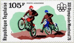 105-franc stamp depicts motorcycle racing with logo and caption of the 1976 Summer Olympic Games in Canada, except there is no motorcycle racing in the Olympics.