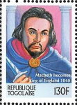 130-franc stamp incorrectly states Macbeth became king of England in 1040, when it should say Scotland.