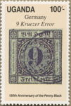 100-shilling stamp depicts Baden 1851 9-kreuzer stamp, but the Uganda stamp indicates the country as "Germany". The German empire did not exist until 1871, so the correct identification should be simply "Baden".
