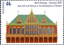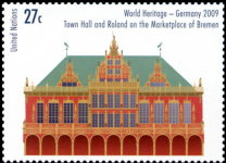 27-cent and 44-cent postage stamps are captioned "Town Hall and Roland on the Marketplace of Bremen", and depicts the town hall, but omits the statue of Roland.