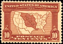 10-cent stamp depicts a map of the USA showing the area of the Louisiana Purchase. But the map omits the original bulge north above the 49th parallel north latitude, and includes a south-east patch extending into Spanish Florida land.