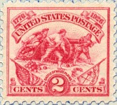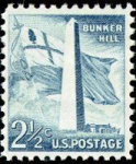 2 1/2-cent stamp depicts the Bunker Hill Monument on Breed's Hill. The stamp errs in the caption "Bunker Hill", rather than "Bunker Hill Monument" or "Breed's Hill".