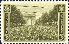 3-cent postage stamp depicts an actual photo of American troops in front of the Arc de Triomphe in France. As there was no airplane flyover, their addition to the stamp design should not have been done.
