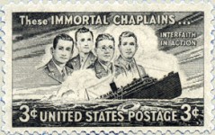 3-cent stamp depicts the sinking of the US Army Transport Dorchester, but the ship sunk bow first, not stern first as pictured.