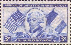 3-cent stamp commemorates the arrival of the Marquis Lafayette in America in 1777, but depicts flags of USA and France current in 1952, rather than flags of 1777.