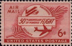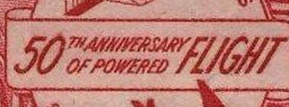6-cent airmail stamp is captioned "50th anniversary of powered flight", but the word "manned" should be included, as powered flight was first achieved in 1848, 105 years before this issue date.