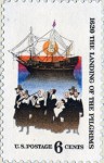 6-cent stamp commemorates the 350th anniversary of the Pilgrims on the Mayflower landing in America. The flag on the ship is the Union Jack as of 1801, incorporating the red "X" of St Patrick's Cross.