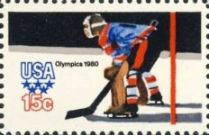 15-cent stamp commemorates the 13th Winter Olympic Games, depicting an ice hockey goalie at his net, but the net has no netting.