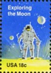 18-cent stamp depicts astronaut standing on the Moon, showing two white spheres in space; what are they?