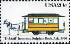 20-cent stamp depicts a "Bobtail" horsecar, but this horse definately has a full tail, not cut short to be called "bobtail".