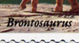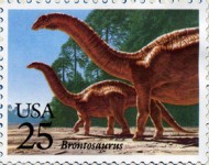 25-cent stamp depicts the Apatosaurus dinosaur, but labels it "Brontosaurus".