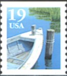 19-cent stamp depicts fishing boat tied to pier with two loops of rope. The image was corrected to one loop of rope in 1994.