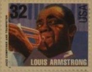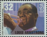 32-cent stamp depicts Louis Armstrong with denomination "32" in white and name in black. 15 days later the same stamp is re-issued with black "32" and white name, along with nine other 32-cent (in black) stamps depicting American musicians (with names in white).