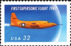 32-cent stamp marks the 50th anniversary of the first supersonic flight by US Air Force Captain Chuck Yeager, depicting his "Glamorous Glennis" Bell X-1 aircraft, but the microprinting misspells the name as "GLAMOROUS GLENNA". The lower word is also curved instead of straight.