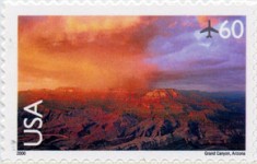 60-cent airmail stamp depicts a mirror reversed image of the Grand Canyon in Arizona. The correct orientation is re-released as a 28-cent stamp in 2010.