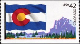 42-cent stamp depicts flag of Colorado state and a mountain, but the mountain appears to be based on Mount Helen in Wyoming.