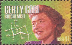 41-cent stamp depicts Gerty Cori; the biochemical structure illustration is incorrect.