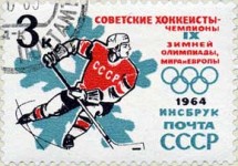 3-kopek stamp depicts Olympic ice hockey with 5-sided snowflake design (should have six).