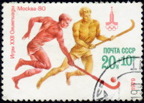20+10-kopeck semi-postal stamp depicts two field hockey players, but from hand/stick positioning, the image is flipped left-right.
