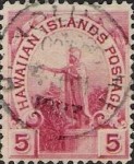 5-cent stamp with statue of Kamehameha omits word "CENTS". An 1899 re-issue includes the denomination.