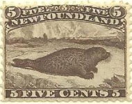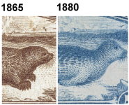 5-cent stamp depicts a seal, but the designer drew forepaws instead of flippers. This was corrected in the 1880 re-use of this image.