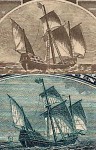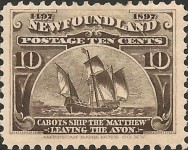 10-cent stamp depicts a ship identified as Cabot's Matthew, but is identical to ship pictured previously on US 1893 1-cent stamp as Christopher Columbus' Santa Maria. Note that the flag has been modified, perhaps to make it look like an English one. During the modification, they should have noted the flag is blowing against the wind, rather than with it, and corrected it.
