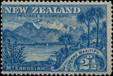 2 1/2-pence stamp depicts Lake Wakatipu, incorrectly inscribed "Wakitipu". Also exists with corrected spelling.