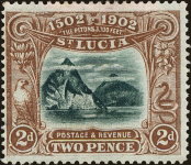 2-pence stamp shows Piton mountains as height "3700 FEET", but actual height is about 2438-2619 feet. But maybe in 1902 that is the height they were estimated to be.