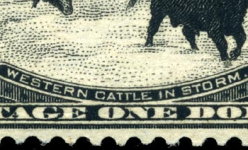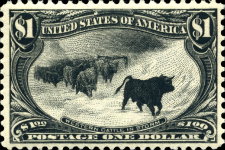 $1 stamp with caption "Western Cattle in Storm" does not depict a scene from the USA, but is from the painting "The Vanguard" by John A. McWhirter, of cattle in the West Highlands of Scotland.