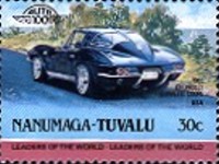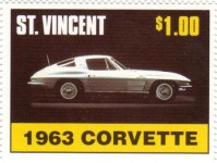 225-cent postage stamp depicts a 1964 Corvette Sting Ray with two errors, labelling it 1963 (1963 had split rear window, which this image does not appear to have), and calling it a "Stingray" (1963-67 are Sting Ray, with 1969-77 using Stingray name). Yellow is not even a standard color for 1963 or 1964, though someone may have had it painted.