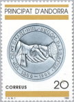 20-peseta postage stamp depicts Andorra 1988 25-diners silver coin.