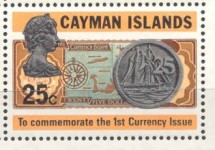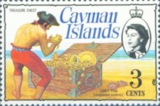 1-cent stamp depicts coins lying on bottom of ocean; 3-cent stamp depicts open treasure chest showing gold coins; 10-cent stamp depicts gold coins lying on bottom of ocean.