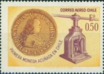 50-centésimo airmail stamp depicts the first Chile coin minted in 1749 and a coin press.