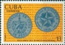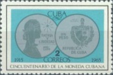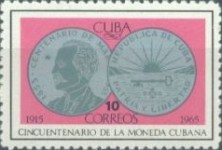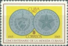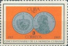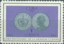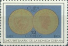 1-centavo stamp depicts a 1962 20-centavo coin; 2-centavo stamp depicts a 1934 1-peso coin; 3-centavo stamp depicts a 1962 40-centavo coin; 8-centavo stamp depicts a 1915 1-peso coin; 10-centavo stamp depicts a 1953 Marti peso coin; 13-centavo stamp depicts a 1915 20-peso coin.