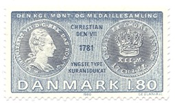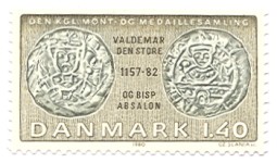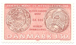1.30-krone stamp depicts frisian sceat of the 9th century; 1.40-krone stamp depicts a silver coin of Valdemar the Great and Absalom, 1157-1182; 1.80-krone stamp depicts a gold 12 mark coin of Christian VII, 1781.