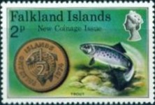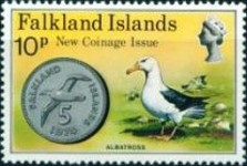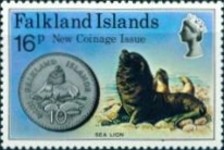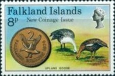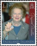 1.20-pound stamp depicts Margaret Thatcher holding a Falkland Islands 2007 coin commemorating the 25th anniversary of liberation from Argentine occupation.