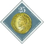 25-pfennig postage stamp depicts a Roman gold coin of 270-73 C.E.