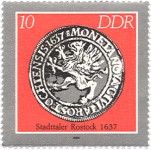 10-pfennig stamp depicts a coin of Rostock, 1637;
