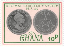 10-pesewa stamp depicts a 1965 10-pesewa coin;