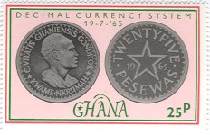 25-pesewa stamp depicts a 1965 25-pesewa coin;