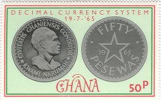50-pesewa stamp depicts a 1965 50-pesewa coin.