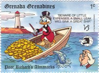 10-cent and 75-cent postage stamps depict Walt Disney characters and gold coins.