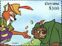 $300 postage stamp depicts characters from Walt Disney's film Robin Hood throwing gold coins.