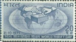 20-paise postage stamp depicts a hand putting a coin in a box.